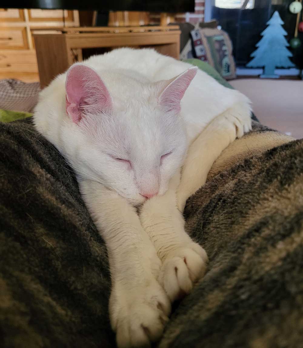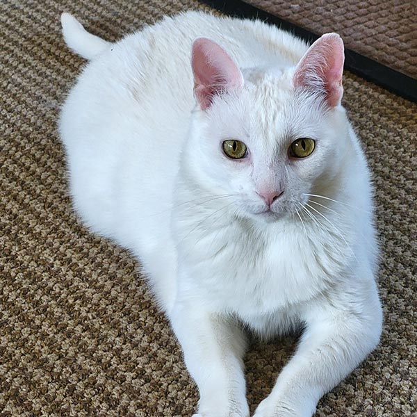 Casper was initially seen in Dr. Bowman-Hensley’s neighborhood early June 2023. Dr. Bowman-Hensley caught glimpses of this gorgeous, all-white cat for a few days and eventually found her hanging out under the bird feeder, trying to survive. She was extremely underweight and severely injured. After a few days of feeding her, Dr. Bowman-Hensley realized she was severely hurt and bleeding, so she trapped her on June 13, 2023. Her injuries were consistent with a hawk’s attempt to get her as she had significant puncture wounds around her head. Dr. Bowman-Hensley took her to urgent care and couldn’t turn her back on this beautiful girl who clung to Dr. Bowman-Hensley at the vet’s office late that night. Dr. Bowman-Hensley and Casper both cried, going and coming to the Emergency Animal Hospital, with Dr. Bowman-Hensley not knowing what to do next as she had never had a cat in her life – it was always a house full of dogs.